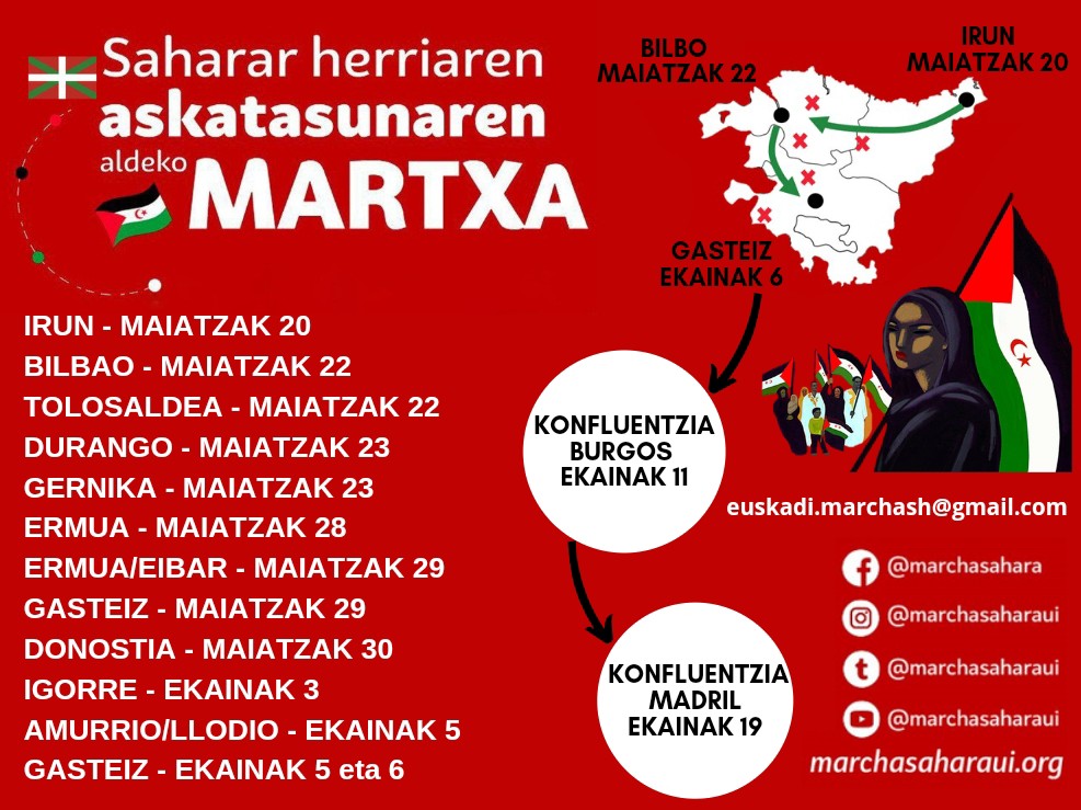 La organización invita a toda la ciudadanía a participar en las actividades que se realizarán a lo largo de los tres territorios. Toda la programación se puede seguir en la web y las redes sociales de la marcha, así como las de la Delegación del Sahara en Euskadi y la UCS - Euskal Fondoa.