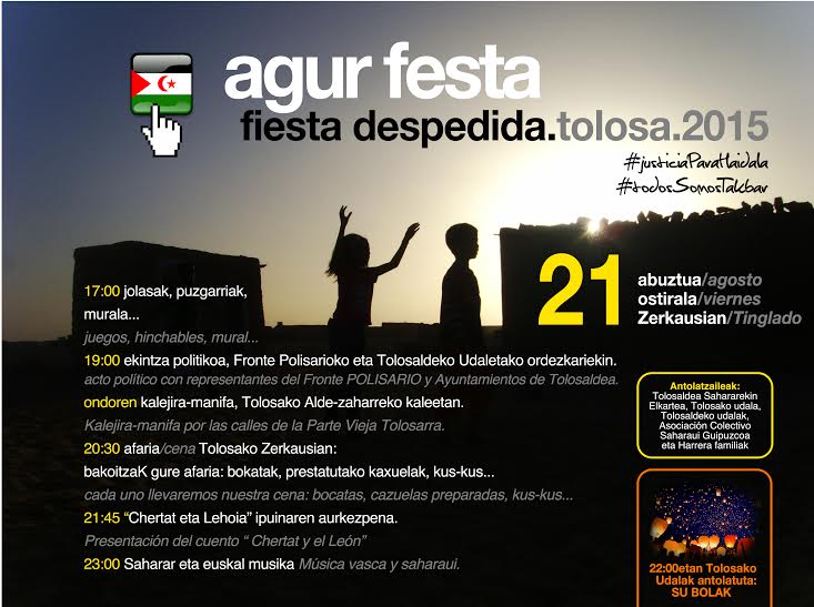 Programa. La fiesta comenzará a primera hora de la tarde en el Zerkausia. A las 17.00, se realizarán juegos infantiles, habrá hinchables y se realizará un mural. A las 19.00 horas se celebrará un acto político con representantes del Frente Polisario y ayuntamientos de Tolosaldea, y partirá la kalejira y manifestación por la Parte Vieja; 20.30, cena; 21.45, presentación del cuento 'Chertat eta Lehoia'; 22.00, acto de los farolillos en la terraza; 23.00, música vasca y saharaui.