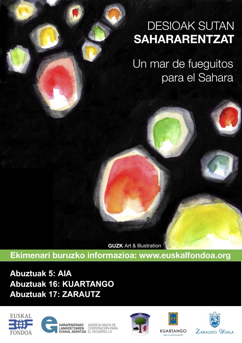 La solidaridad es la ternura de los pueblos, y Zarautz hace tres años quiso acoger con más cariño que nunca a los niños y niñas saharauis. A los y las menores que llegaron a pasar las vacaciones en paz, les quisimos demostrar que tenemos al Pueblo Saharaui en nuestros corazones. A mediados de agosto, quisimos dar fuego y poner volando a cientos de deseos, para que al ver las estrellas en el Sáhara sintieran la solidaridad que les llega desde el País Vasco: Denominamos la iniciativa Un mar de fueguitos para el Sáhara. Queríamos encender con solidaridad el malecón de Zarautz y, además de ser un espectáculo bonito, queríamos dar la oportunidad a quien quisiera de dar fuego y volar deseos.