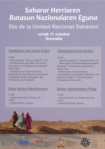 Datorren ostegunean, urriak 11, Saharar Batasun Nazionalaren Eguna ospatuko da Donostian, Tabakaleran. Izan ere, badira 43 urte Marokok eta Mauritaniak, Estatu espainiarraren oniritziarekin, Mendebaldeko Sahara okupatu eta bertako biztanleak kanporatu eta jazartzen hasi zirela. Testuinguru horretan, 1975eko urriaren 12an Herri Sahararrak Fronte Polisarioaren oinarriekin bate gin zuen, Saharar Batasun Nazionalaren Eguna izendatuz, eta haien lurraldea bereskuratzeko indarrak batuz.