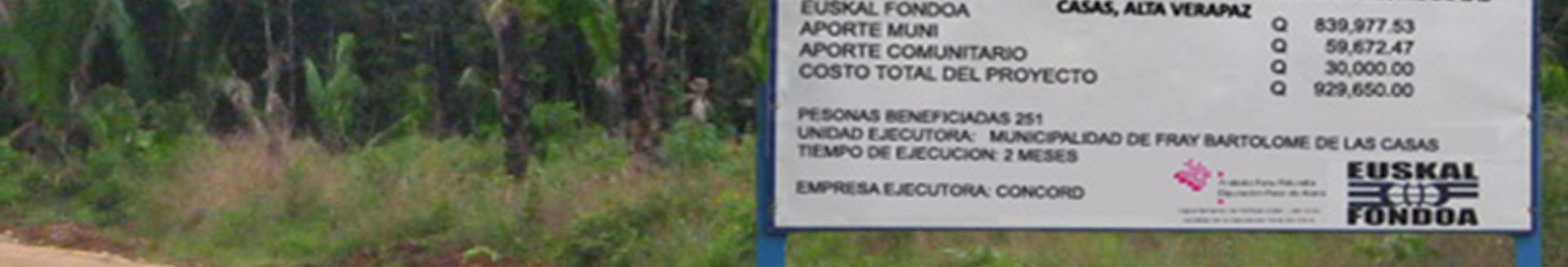Hiriguneko herritarrak edatekoo urez hornitzeko sistema eraikitzea. Chahal. I fasea San Jose Purulan 3 km landa-bide birgaitzea. Fray Bartolomé de Las Casas. II Fasea Erakunde-gaitasuna indartzea, udal-kudeaketan emakumeen eta gizonen arteko berdintasuna kontuan har dezaten. III fasea. Alta Verapaz. Edateko ur hornidura hirigunean. II fasea. Raxruha San Jose Purulan 3 km landa-bide birgaitzea. Fray Bartolomé de Las Casas. I Fasea San Jose La Pasion auzoa edateko urez hornitzeko grabitate bidezko sistema bat eraikitzea. Chahal Erakunde-gaitasuna indartzea, udal-kudeaketan emakumeen eta gizonen arteko berdintasuna kontuan har dezaten. II fasea. Alta Verapaz. Erakunde-gaitasuna indartzea, udal-kudeaketan emakumeen eta gizonen arteko berdintasuna kontuan har dezaten. I fasea. Alta Verapaz. San Luis Tonitzul, La Cañada eta 28 de Septiembre auzuneetan edateko ur sistema eraikitzea. Raxruha Sexan II Komunitatean 4 km landa-bide egitea.II fasea. Fray Bartolomé de Las Casas Sesincheu, Setaña eta Sailá auzuneetan edateko ura hornidura. Chahal Sexan II Komunitatean 4 km landa-bide egitea. I. fasea. Fray Bartolomé de Las Casas